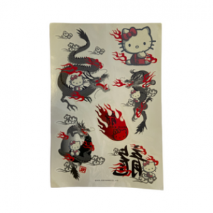 Dê um toque de originalidade ao seu visual com as tatuagens temporárias Japan Hello Kitty. Inspiradas na cultura japonesa, estas tatuagens combinam a icónica personagem com elementos tradicionais como dragões, chamas e símbolos orientais, criando um efeito marcante e cheio de estilo.