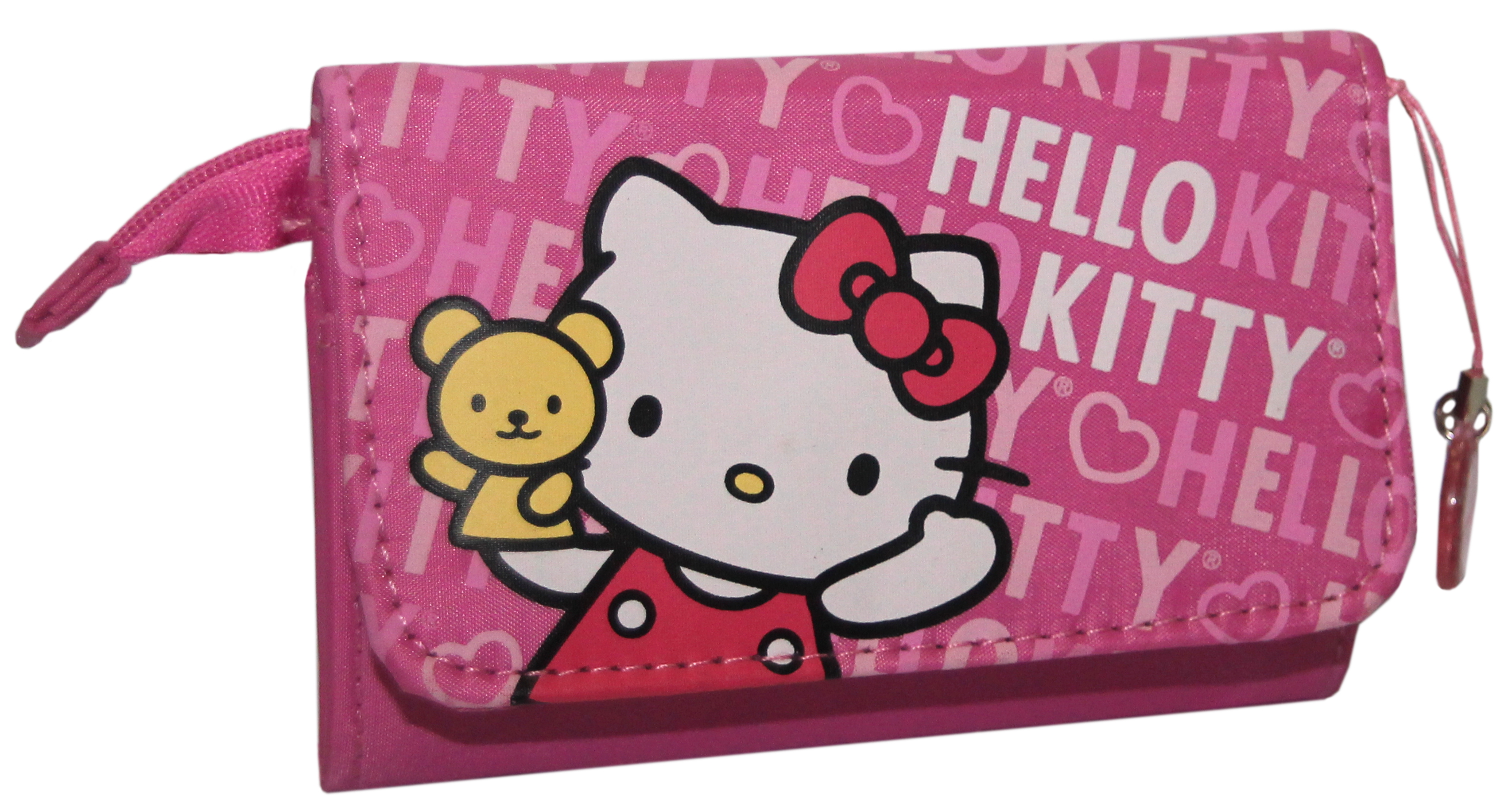 A carteira Hello Kitty em rosa é um acessório encantador e funcional, perfeito para os mais pequenos ou fãs da personagem que procuram uma opção prática para o dia-a-dia. Com um fundo decorado com o nome "Hello Kitty" em várias orientações e tons, destaca-se pela imagem da Hello Kitty com o seu inseparável ursinho, num estilo doce e divertido.