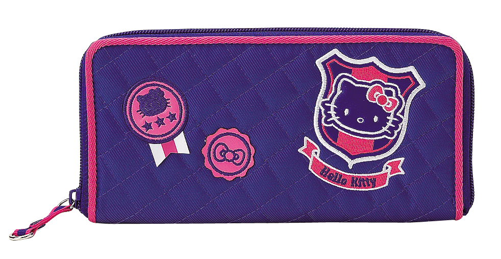 A carteira Emblem Hello Kitty é a escolha perfeita para quem procura um acessório moderno com um toque desportivo e feminino. Com um design em roxo acolchoado e detalhes em rosa, apresenta emblemas inspirados no universo escolar e o rosto da Hello Kitty dentro de um escudo, conferindo-lhe um estilo único e original.