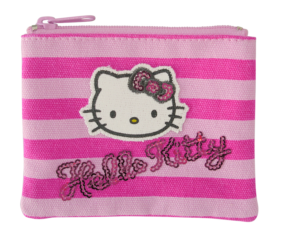 Decorado com riscas em tons de rosa e a imagem da Hello Kitty com um laço brilhante, este porta-moedas pertence à coleção Spangle. Leve e resistente, combina funcionalidade com um toque de brilho e diversão, sendo ideal para fãs da personagem que apreciam acessórios coloridos e encantadores.