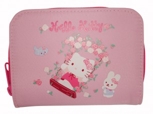 A carteira Swing Hello Kitty destaca-se pelo seu visual delicado e encantador, sendo ideal para quem aprecia acessórios suaves e femininos. Com um tom cor-de-rosa muito agradável, esta carteira apresenta uma ilustração amorosa da Hello Kitty num baloiço rodeada por flores, acompanhada de pequenos animais adoráveis, criando um ambiente alegre e tranquilo.