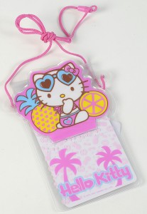 A carteira de vinil com fio Hello Kitty é o acessório ideal para levar pequenos objectos de forma prática e divertida. Com um design tropical em tons de rosa, apresenta a Hello Kitty com óculos de sol rodeada de frutas e palmeiras, perfeita para os dias de verão ou passeios descontraídos.