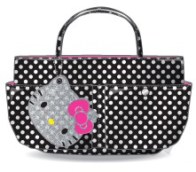 A bolsa de mão Hello Kitty apresenta um design encantador e divertido, ideal para as fãs da personagem mais adorada do universo Sanrio. Com um padrão clássico de bolinhas brancas sobre fundo preto e um aplique da Hello Kitty em relevo com laço cor-de-rosa, esta bolsa combina estilo com um toque de ternura.