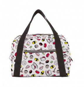 O saco de mão Sushi Hello Kitty é a escolha ideal para quem procura um acessório prático com um toque divertido e original. De fundo branco com detalhes pretos, apresenta um padrão colorido inspirado em peças de sushi e na icónica Hello Kitty, criando um visual jovem e descontraído.