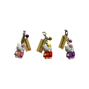 Cada pendente inclui um pequeno sino metálico e uma plaquinha com caracteres japoneses, tornando-o um item especial para os fãs da Hello Kitty e da estética oriental.
