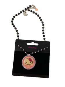 A corrente, composta por contas rendondas em tons de preto e rosa, adiciona contraste e profundidade ao design, tornando este colar uma peça versátil para diversas ocasiões. Leve e confortável de usar, é ideal para completar um look casual ou dar um toque especial a uma ocasião mais formal. Uma escolha encantadora para os fãs da Hello Kitty que apreciam acessórios distintos e requintados.