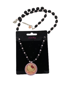 A corrente, composta por contas ovais em tons de preto e rosa, adiciona contraste e profundidade ao design, tornando este colar uma peça versátil para diversas ocasiões. Leve e confortável de usar, é ideal para completar um look casual ou dar um toque especial a uma ocasião mais formal. Uma escolha encantadora para os fãs da Hello Kitty que apreciam acessórios distintos e requintados.