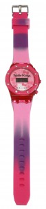 A caixa do relógio está equipada com luzes LED que piscam em várias cores, acrescentando um efeito luminoso que torna cada momento ainda mais especial. O mostrador, decorado em tons de rosa com a imagem da Hello Kitty, é fácil de ler e cativa pela sua simpatia.