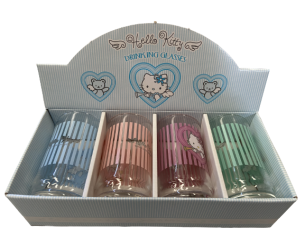 O conjunto de 4 copos com caixa Stripe Hello Kitty é perfeito para quem deseja adicionar um toque elegante e divertido à mesa. Com um design delicado e às riscas, cada copo apresenta cores suaves – azul, laranja, rosa e verde – e a adorável Hello Kitty, tornando-o ideal para qualquer ocasião.