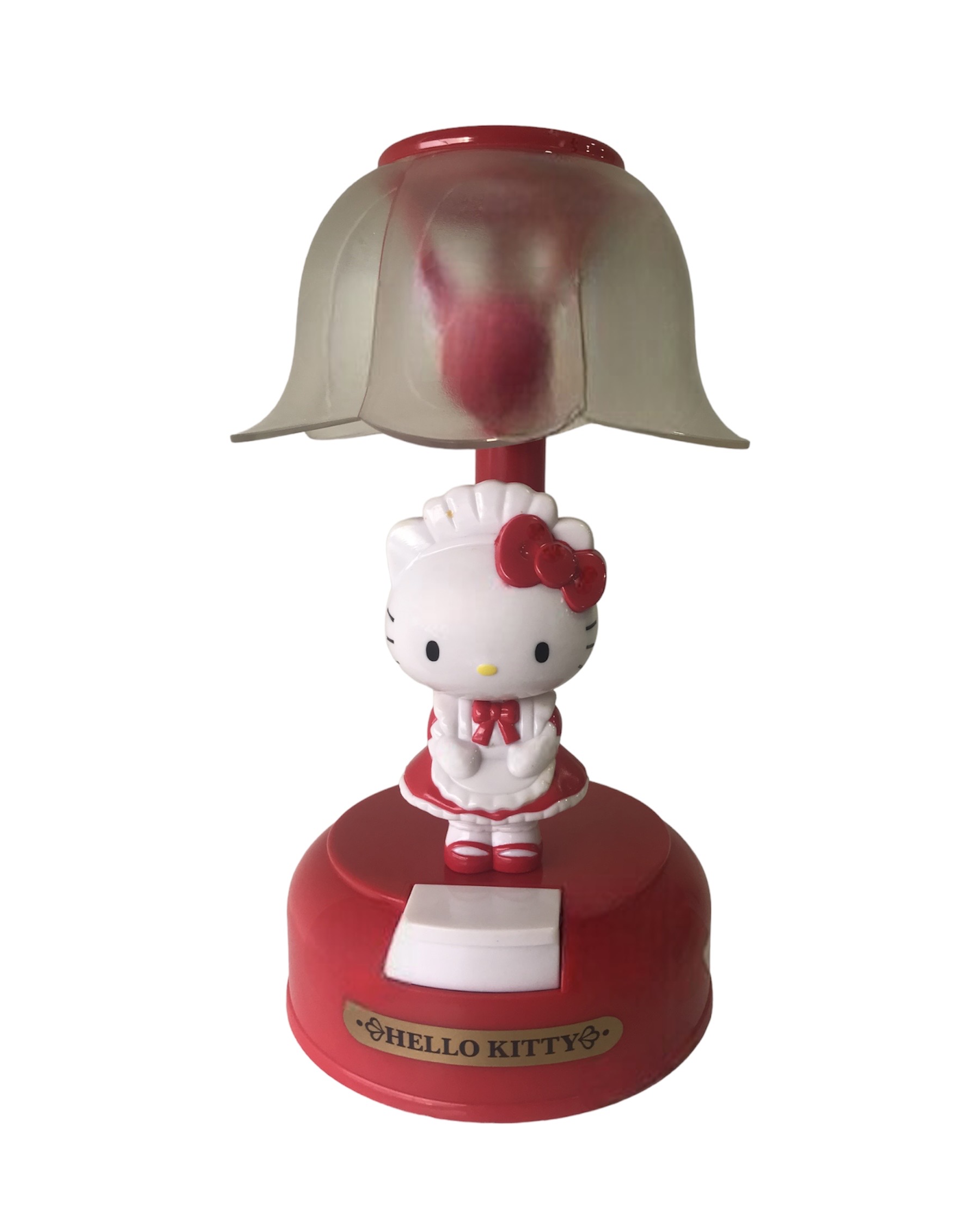 O candeeiro, em vermelho suave, oferece uma luz calmante que é ideal para quartos de crianças ou para adicionar um elemento lúdico a qualquer outro ambiente. O design inclui uma base estável e uma figura da Hello Kitty que não só serve como um ponto focal decorativo, mas também infunde um ambiente de alegria e conforto.