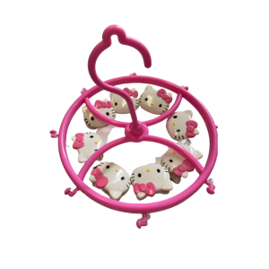 O suporte para roupas com molas Hello Kitty é uma solução criativa e prática para manter as roupas e acessórios organizados de forma encantadora. Este suporte, num vibrante tom de rosa e adornado com imagens da Hello Kitty nas molas, é perfeito para qualquer fã da personagem, adicionando um toque de alegria e funcionalidade ao espaço.