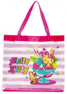 O saco de ombro em vinil Hello Kitty Sundae é um acessório divertido e vibrante, ideal para os dias de verão ou momentos de lazer. Com um design alegre em tons de rosa, apresenta a Hello Kitty num cenário doce e colorido, sentada numa taça de gelado ao lado de um coelhinho, rodeada de riscas suaves em branco e rosa que reforçam o ambiente descontraído e festivo.