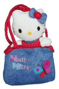 Peluche Bolsa Denim Hello Kitty, 19 x 21 cm - Azul e Vermelho