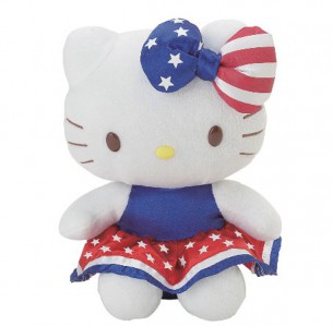 O peluche American Hello Kitty é um adorável brinquedo inspirado no espírito patriótico. Com dimensões de 20x15 cm, apresenta um visual encantador com as cores e padrões da bandeira americana no vestido e no laço.